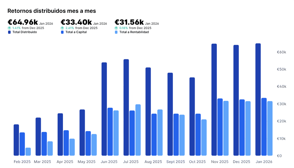 Esta es la evolución mensual del retorno que obtienen los inversores por sus participaciones en nuestros proyectos. Estos retornos están compuestos por la devolución del capital invertido y la generación de intereses.