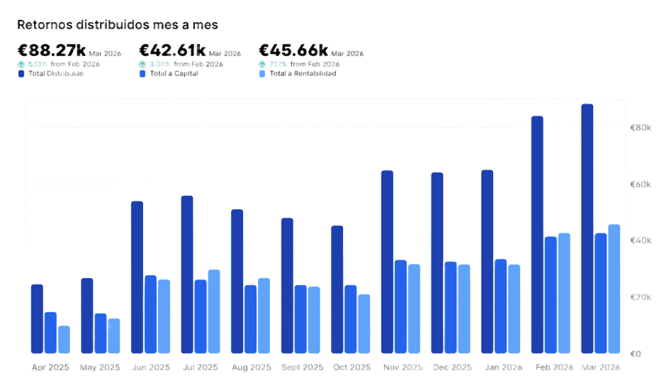 Esta es la evolución mensual del retorno que obtienen los inversores por sus participaciones en nuestros proyectos. Estos retornos están compuestos por la devolución del capital invertido y la generación de intereses.
